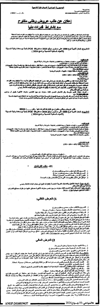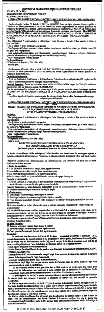 إعلان عن طلب عروض وطني مفتوح انجاز ثانوية نوع 1000 على مستوى موقع 3020 مسكن 09 POS بلدية بوسعادة (الأحياء السكنية المدمجة برنامج 2024)/ مديرية التجهيزات العمومية لولاية المسيلة