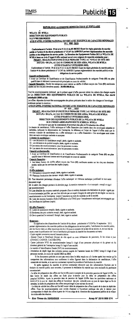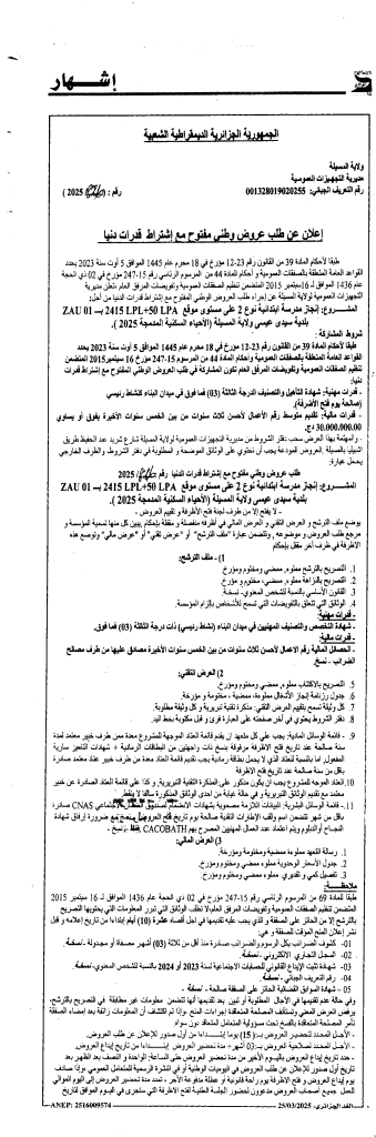 إعلان عن طلب عروض وطني مفتوح انجاز مدرسة ابتدائية بلدية سيدي عيسى/ مديرية التجهيزات العمومية لولاية المسيلة