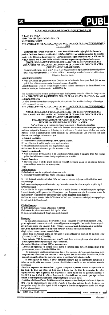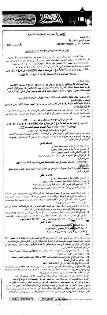 إعلان عن طلب عروض وطني مفتوح انجاز مدرسة ابتدائية بلدية ونوغة/ مديرية التجهيزات العمومية لولاية المسيلة