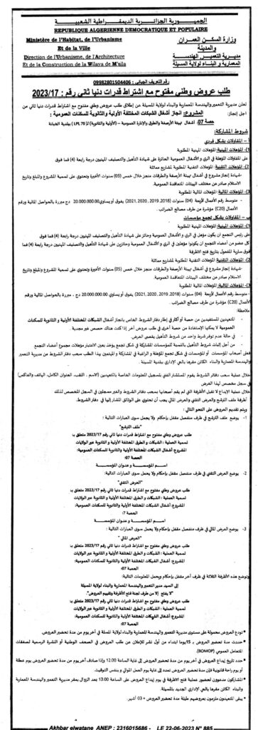 إعلان عن طلب عروض وطني مفتوح ثاني 2023/17 مديرية التعمير والهندسة المعمارية والبناء لولاية المسيلة