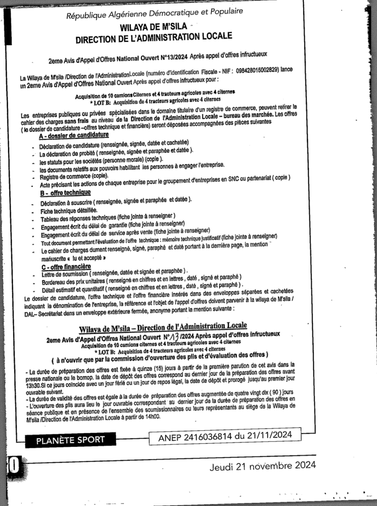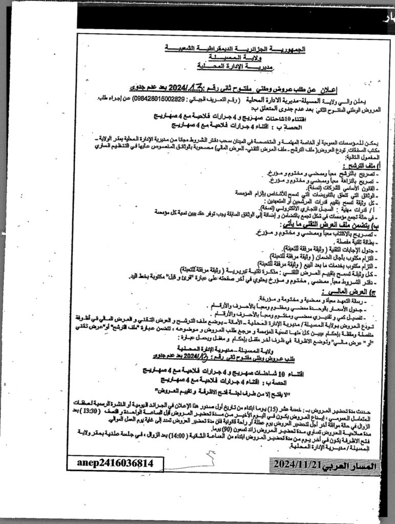 إعلان عن طلب عروض وطني مفتوح ثاني 2024/13 بعد عدم جدوى/ مديرية الإدارة المحلية لولاية المسيلة