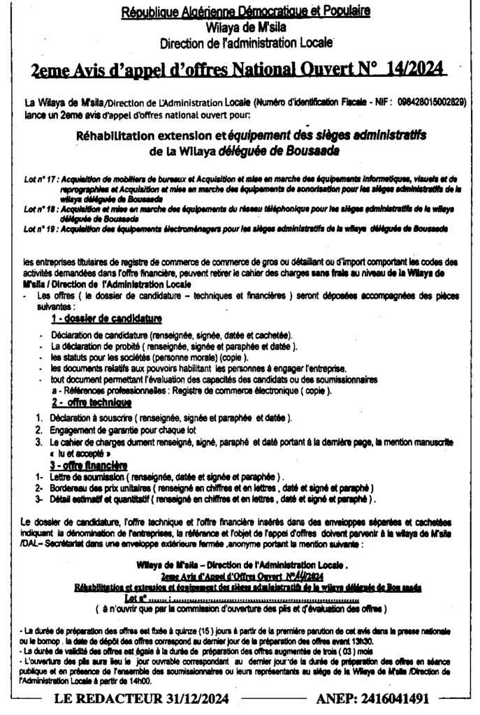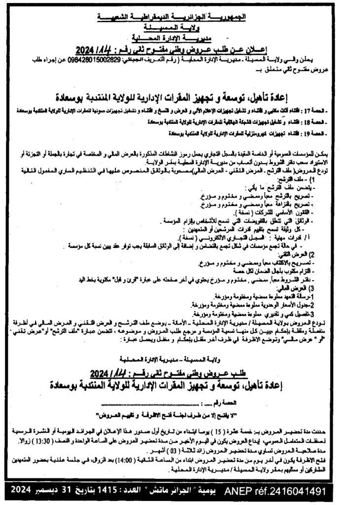 إعلان عن طلب عروض وطني مفتوح ثاني 2024/14/ مديرية الادارة المحلية بولاية المسيلة