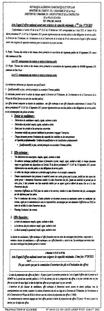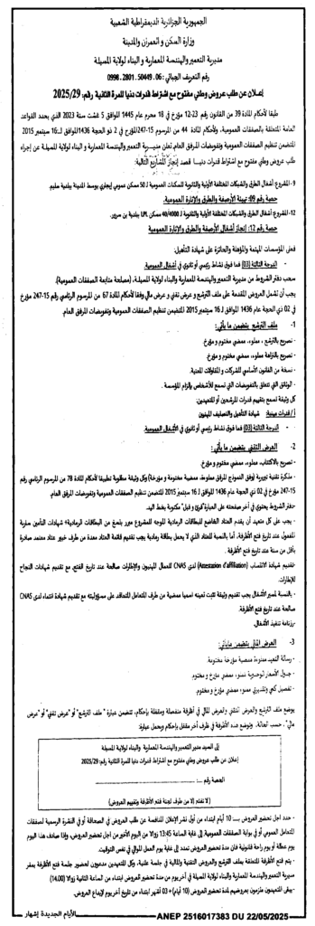 إعلان عن طلب عروض وطني مفتوح للمرة الثانية 2025/29 مديرية التعمير والهندسة المعمارية والبناء لولاية المسيلة