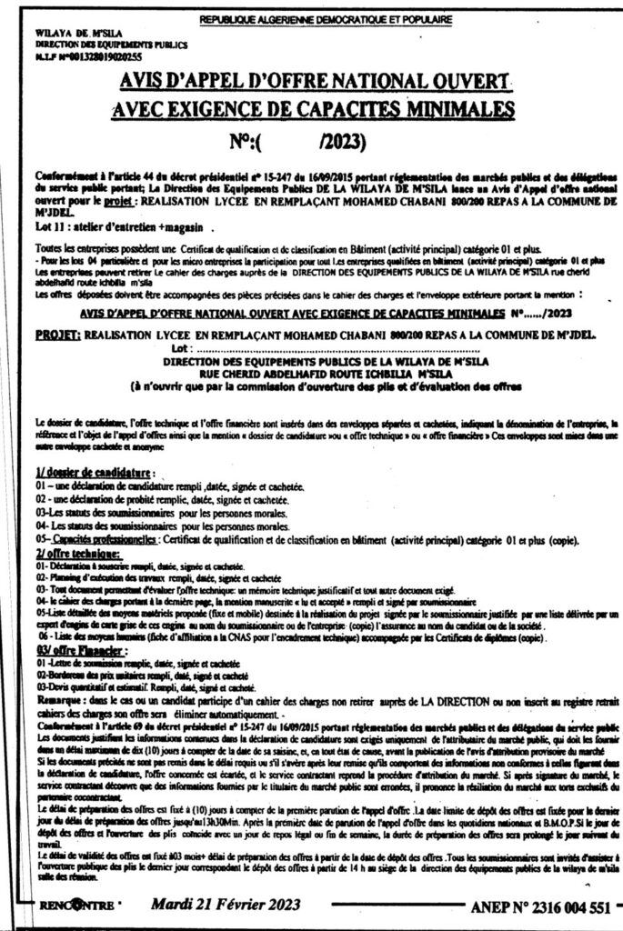 إعلان عن طلب عروض وطني مفتوح/ مديرية التجهيزات العمومية لولاية المسيلة