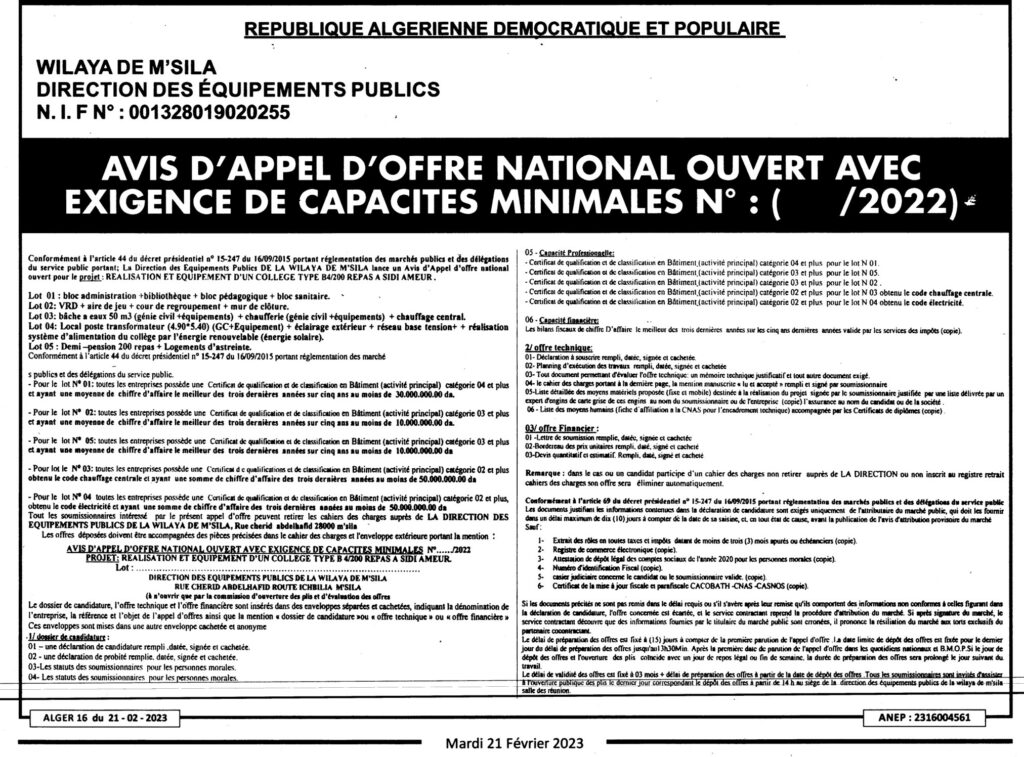 إعلان عن طلب عروض وطني مفتوح/ مديرية التجهيزات العمومية لولاية المسيلة