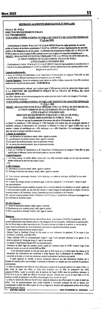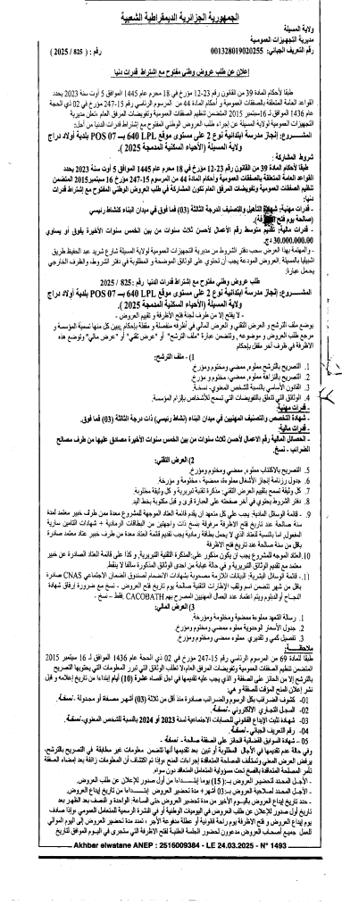 انجاز مدرسة ايتدائية نوع 02 على مستوى موقع 640 LPL بـ POS 07 بلدية أولاد دراج ولاية المسيلة (الأحياء السكنية المدمجة 2025)24 مارس، 20250 18 شاركها فيسبوك X مشاركة عبر البريد طباعة