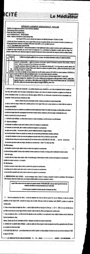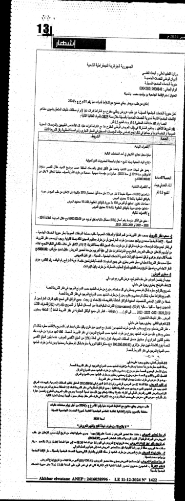 إعلان عن طلب عروض وطني مفتوح 01/م خ ج م/2024 مديرية الخدمات الجامعية بالمسيلة
