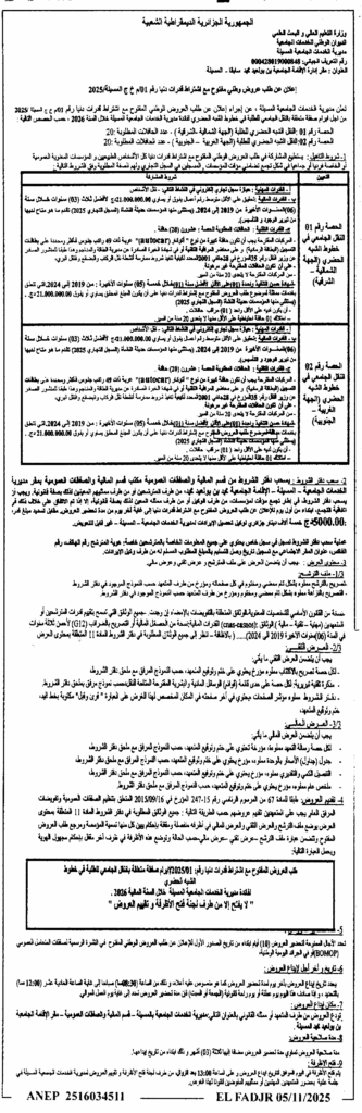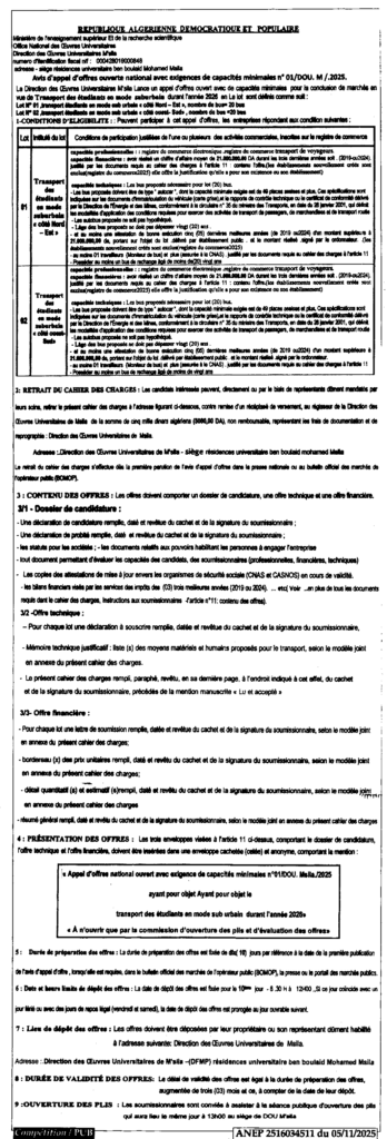 إعلان عن طلب عروض وطني مفتوح 01/م خ ج م/2025 النقل الجامعي في الخطوط الشبه الحضري/ مديرية الخدمات الجامعية المسيلة