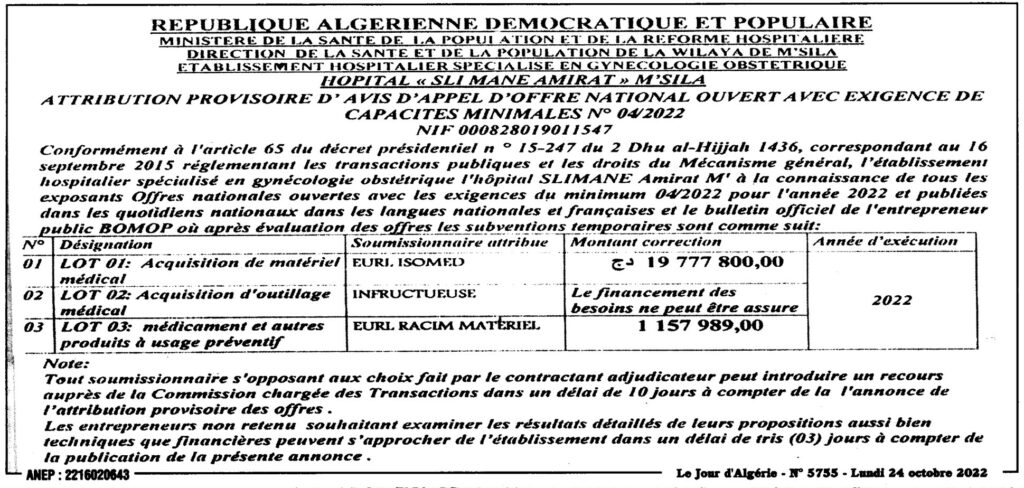 إعلان عن طلب عروض وطني مفتوح 2022/04 المؤسسة الاستشفائية سليمان عميرات بالمسيلة
