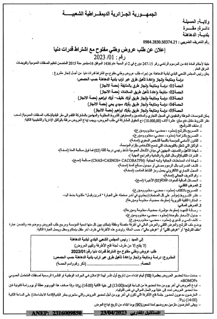إعلان عن طلب عروض وطني مفتوح 2023/01 بلدية الدهاهنة