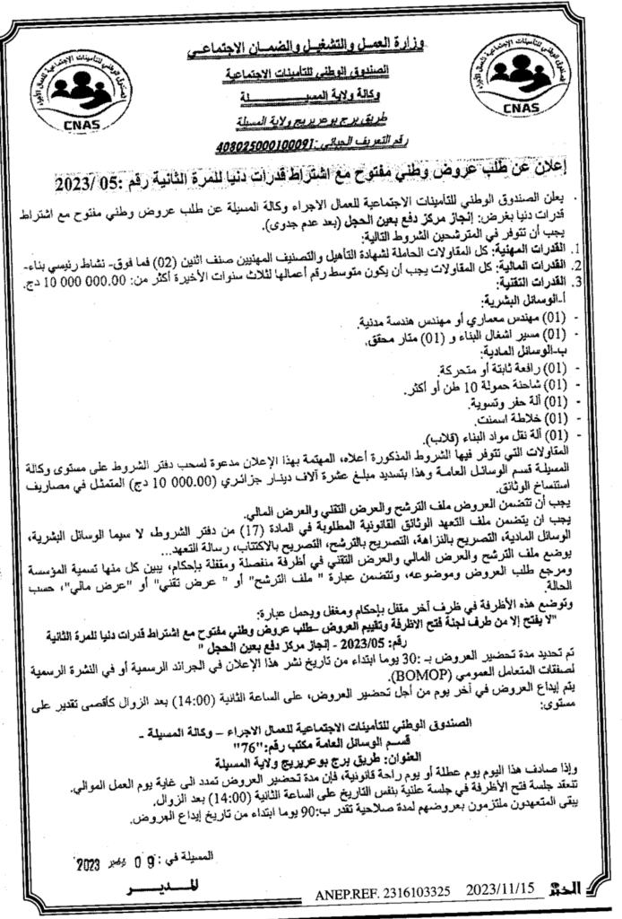إعلان عن طلب عروض وطني مفتوح 2023/05 الصندوق الوطني للتأمينات الاجتماعية لولاية المسيلة