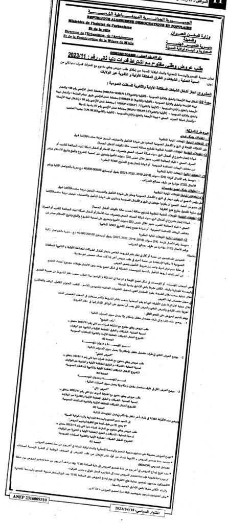 إعلان عن طلب عروض وطني مفتوح 2023/11 مديرية التعمير والهندسة المعمارية والبناء لولاية المسيلة