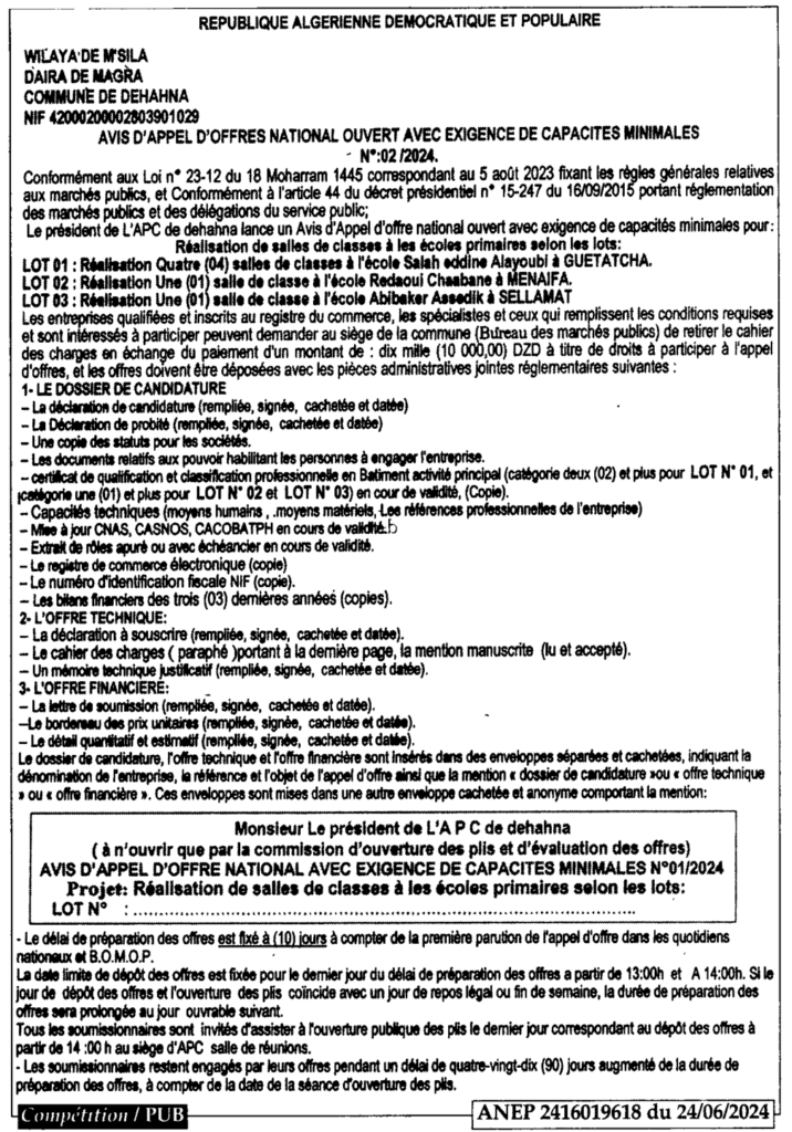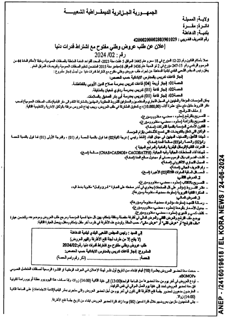 إعلان عن طلب عروض وطني مفتوح 2024/02 بلدية الدهاهنة