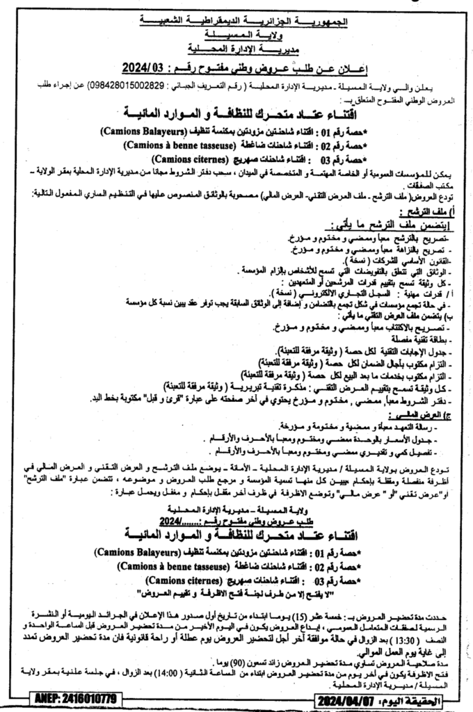 إعلان عن طلب عروض وطني مفتوح 2024/03 مديرية الادارة المحلية لولاية المسيلة