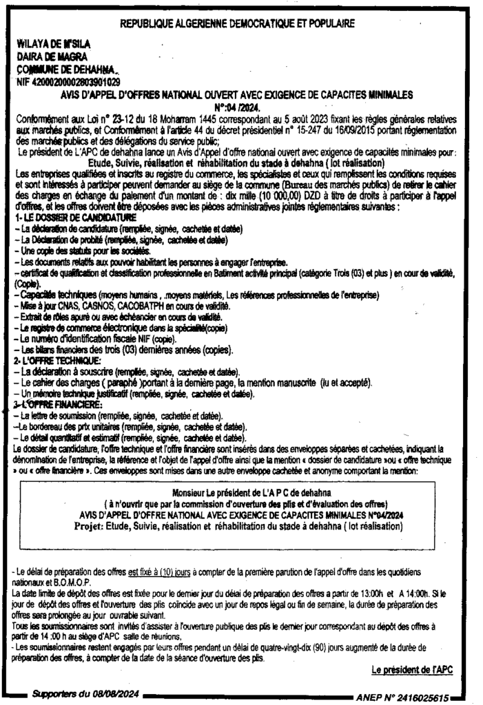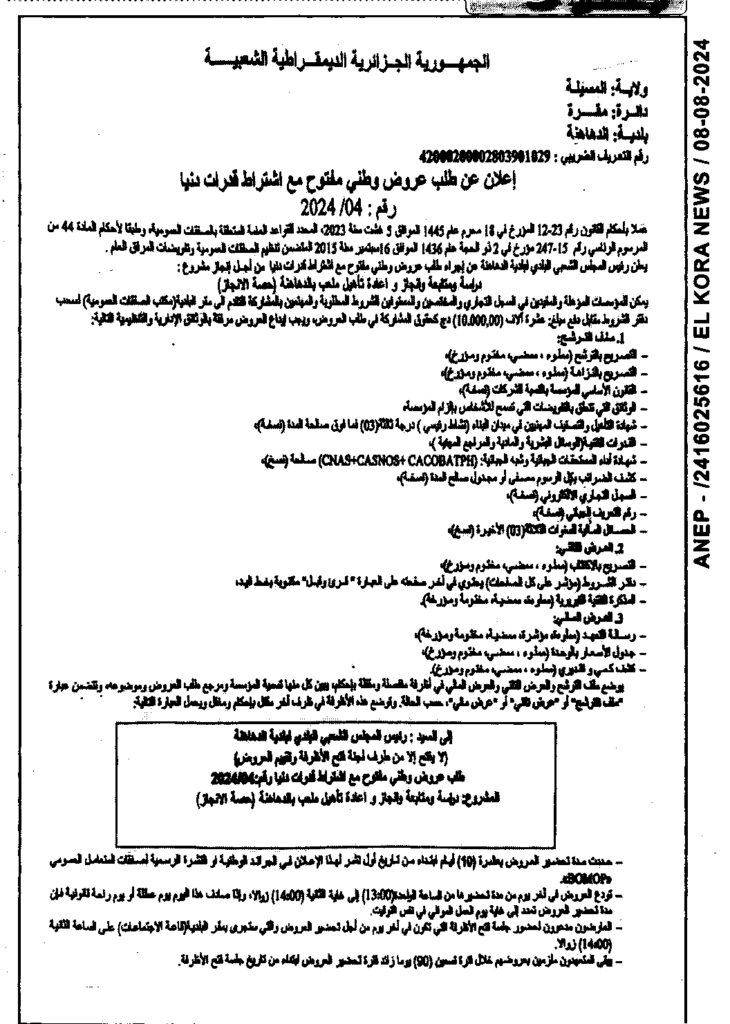 إعلان عن طلب عروض وطني مفتوح 2024/04 بلدية الدهاهنة