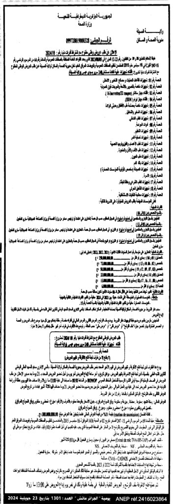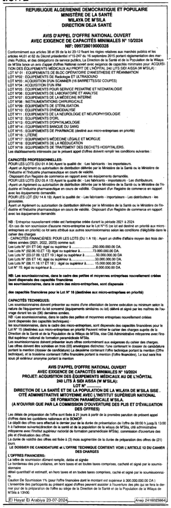 إعلان عن طلب عروض وطني مفتوح 2024/10 مديرية الصحة والسكان لولاية المسيلة