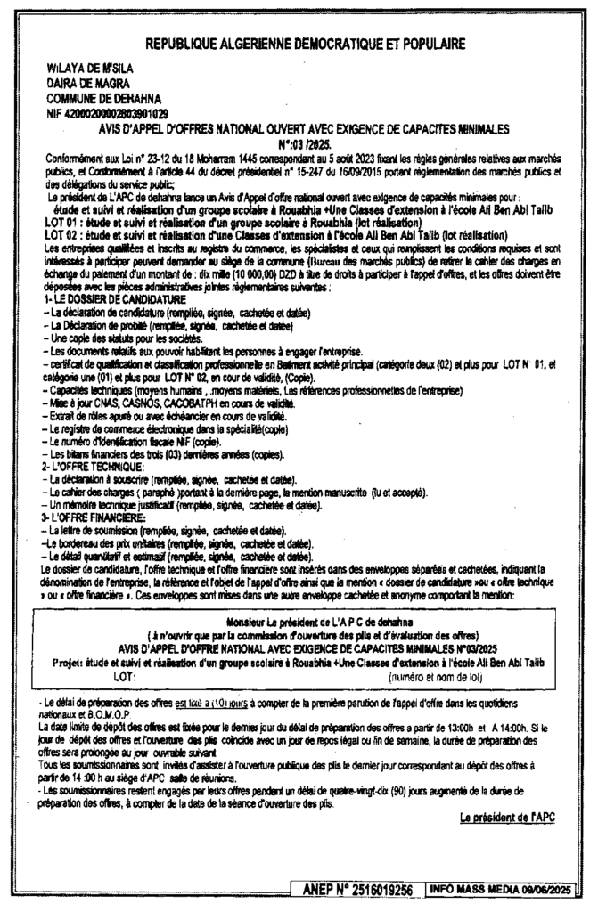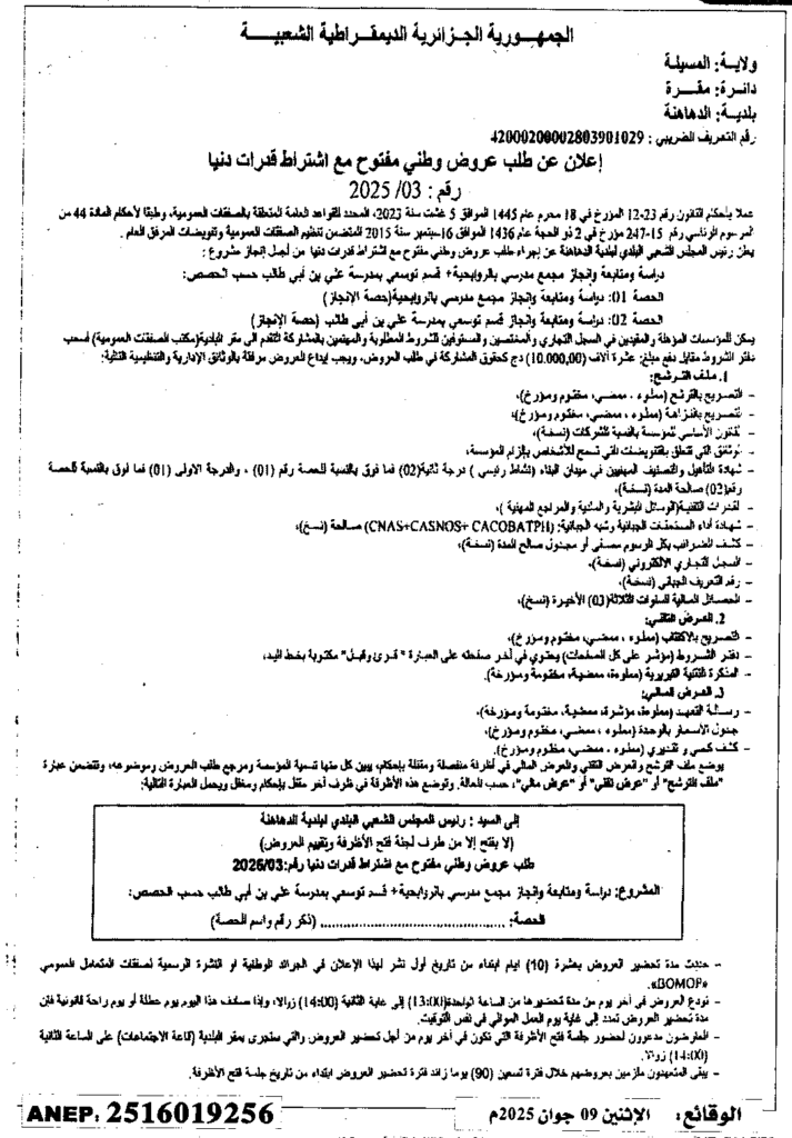 دراسة ومتابعة وانجاز مجمع مدرسي بالروابحية + قسم توسيعي بمدرسة علي بن أبي طالب (حصة الانجاز)10 يونيو، 20250 26 شاركها فيسبوك X مشاركة عبر البريد طباعة
