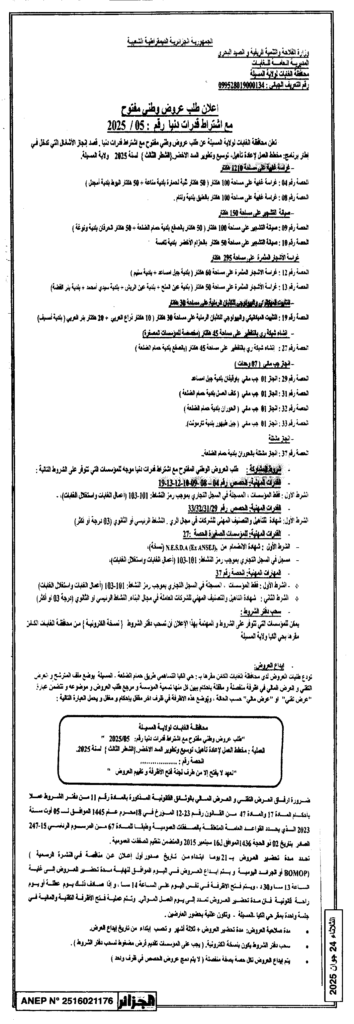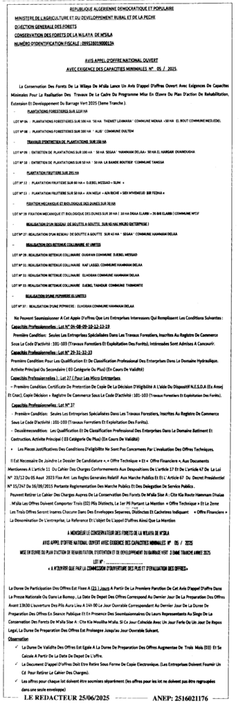 إعلان عن طلب عروض وطني مفتوح 2025/05 محافظة الغابات لولاية المسيلة