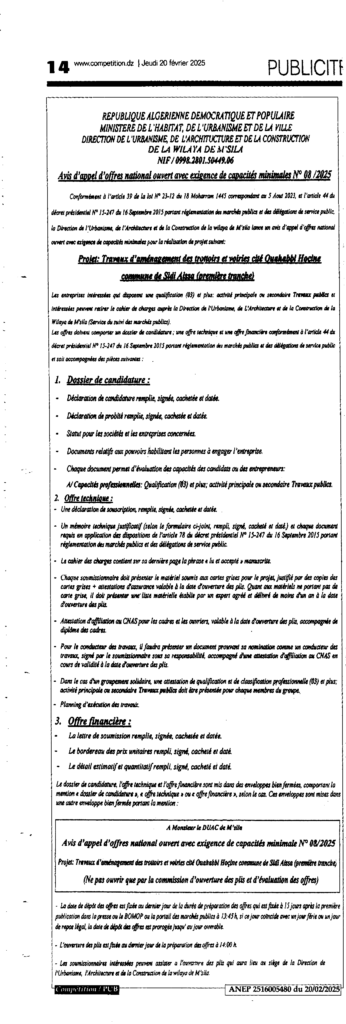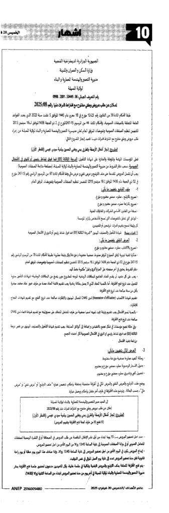 إعلان عن طلب عروض وطني مفتوح 2025/08 مديرية التعمير والهندسة المعمارية والبناء لولاية المسيلة