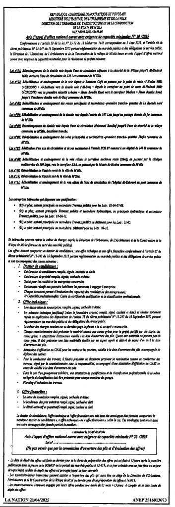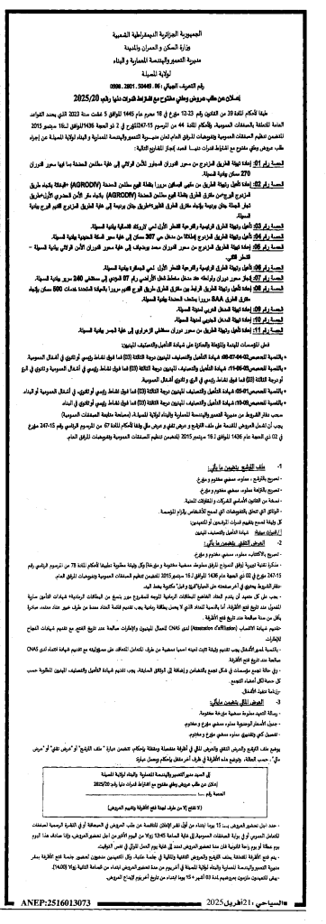 إعلان عن طلب عروض وطني مفتوح 2025/20 مديرية التعمير والهندسة المعمارية والبناء لولاية المسيلة
