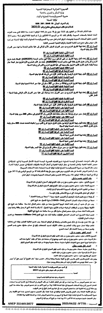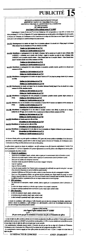إعلان عن طلب عروض وطني مفتوح 2025/21 مديرية التعمير والهندسة المعمارية والبناء لولاية المسيلة
