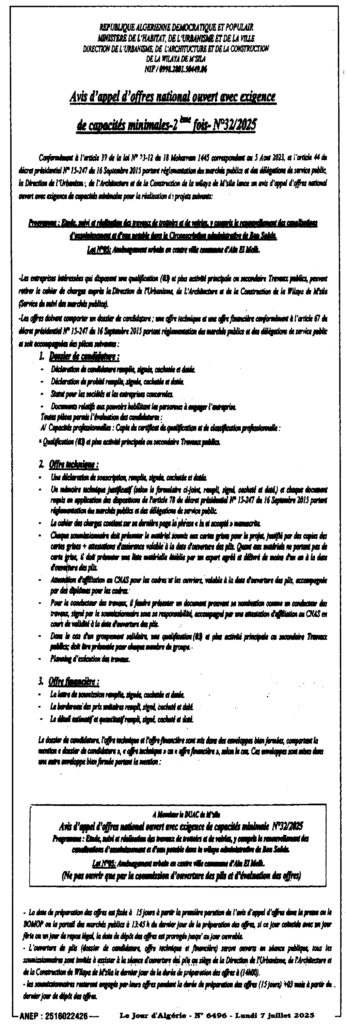 إعلان عن طلب عروض وطني مفتوح 2025/32 للمرة الثانية/ مديرية التعمير والهندسة المعمارية والبناء لولاية المسيلة