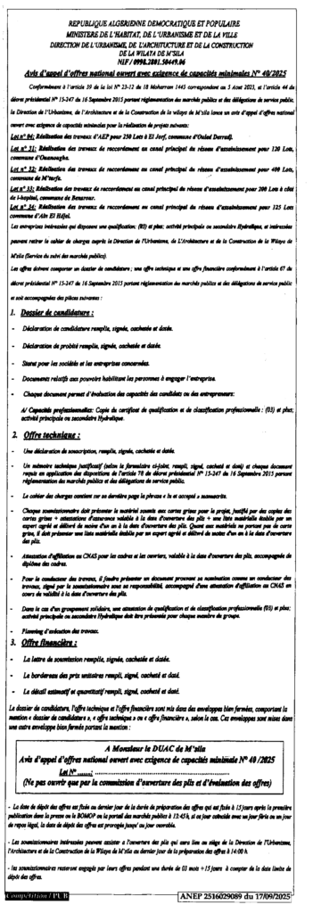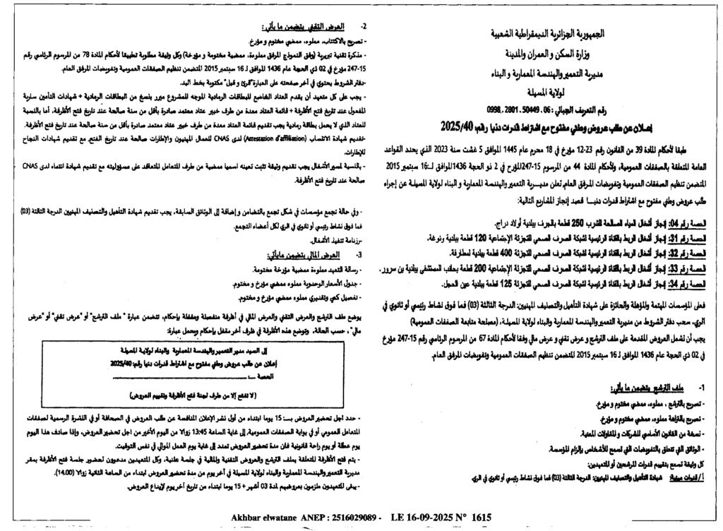 إعلان عن طلب عروض وطني مفتوح 2025/40 مديرية التعمير والهندسة المعمارية والبناء لولاية المسيلة