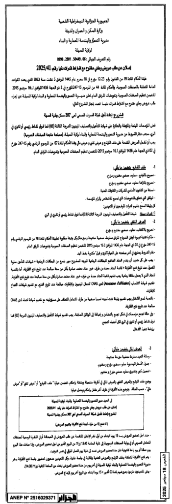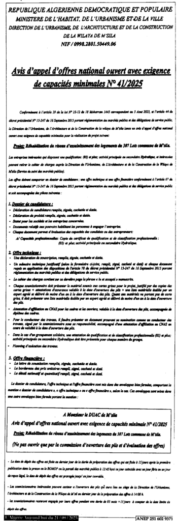 إعلان عن طلب عروض وطني مفتوح 2025/41 مديرية التعمير والهندسة المعمارية والبناء لولاية المسيلة