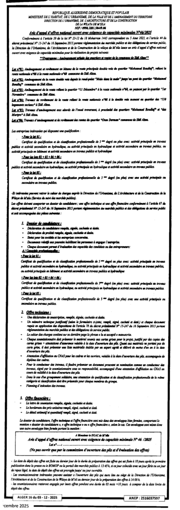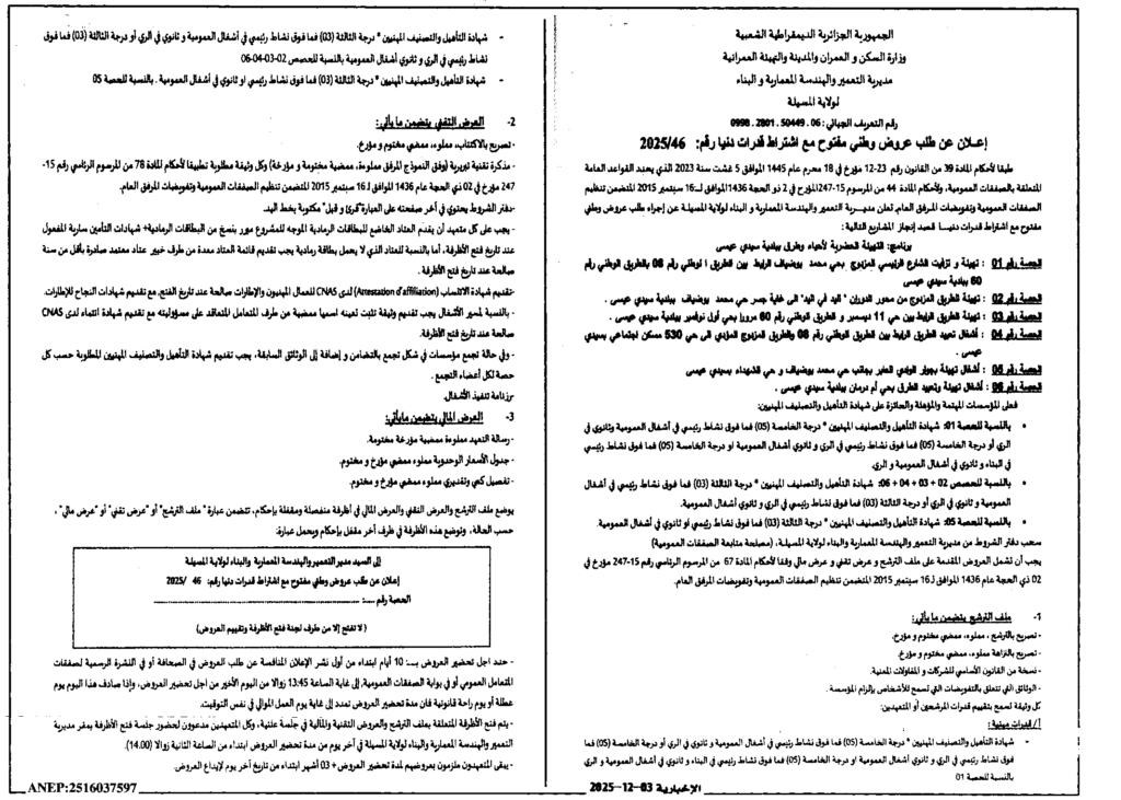 إعلان عن طلب عروض وطني مفتوح 2025/46 مديرية التعمير والهندسة المعمارية والبناء لولاية المسيلة