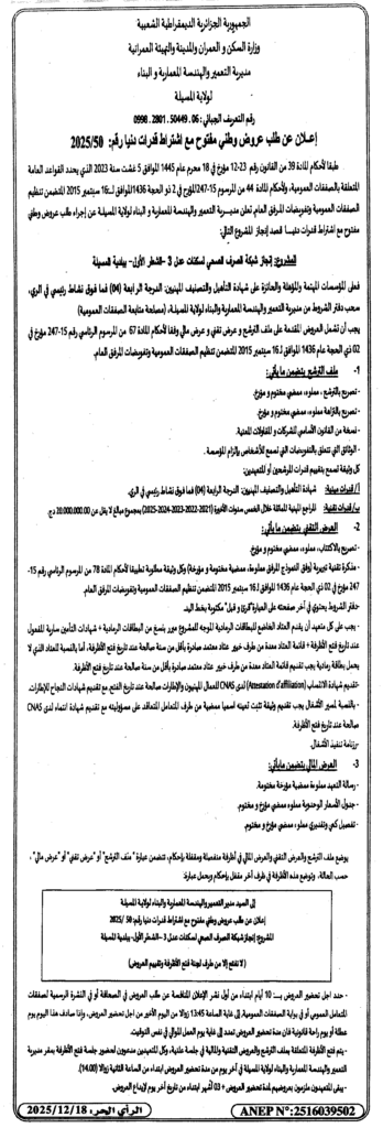 إعلان عن طلب عروض وطني مفتوح 2025/50 مديرية التعمير والهندسة المعمارية والبناء لولاية المسيلة