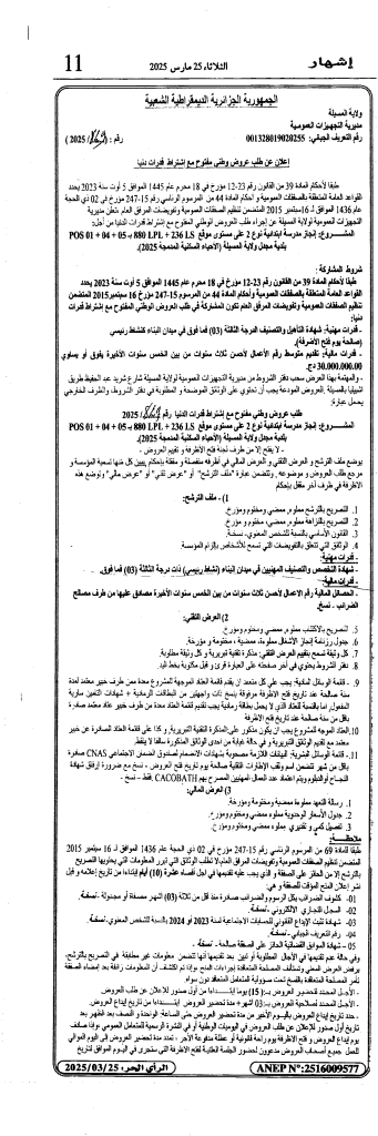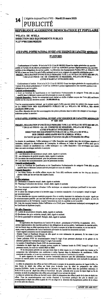 إعلان عن طلب عروض وطني مفتوح 2025/829 انجاز مدرسة ابتدائية بلدية امجدل لولاية المسيلة
