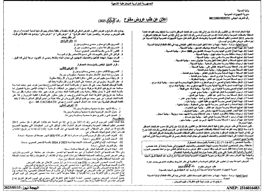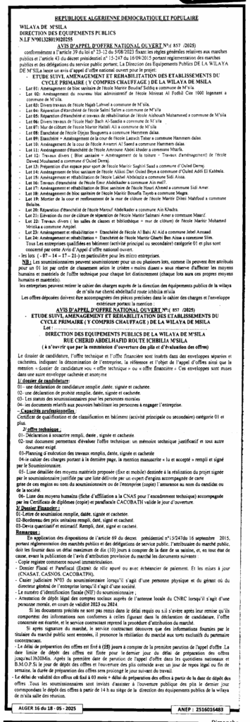 دراسة، متابعة، تهيئة وإعادة تاهيل المؤسسات للطور الابتدائي (بما في ذلك التدفئة) لولاية المسيلة18 مايو، 20250 30 شاركها فيسبوك X مشاركة عبر البريد طباعة