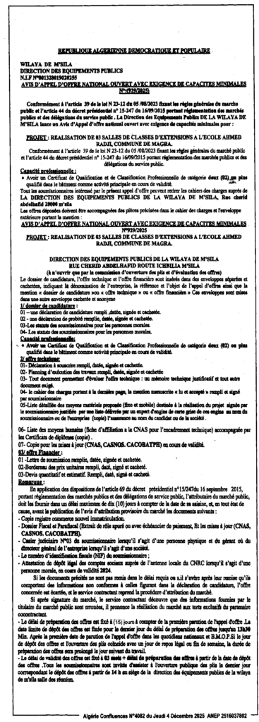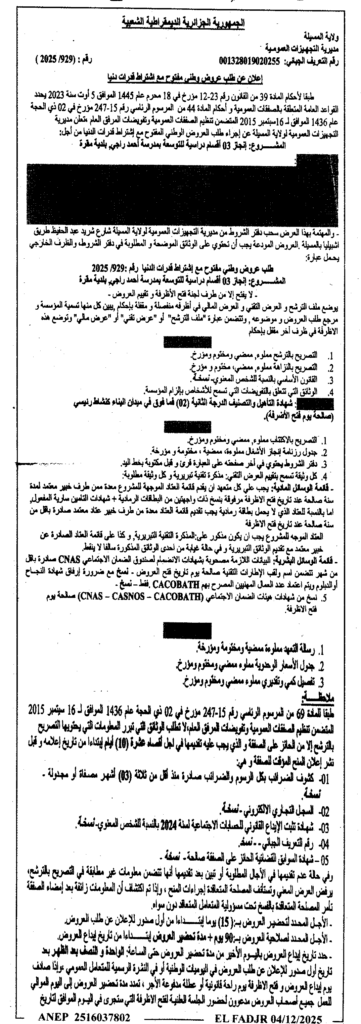 إعلان عن طلب عروض وطني مفتوح 2025/929 مديرية التجهيزات العمومية لولاية المسيلة