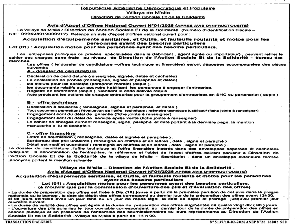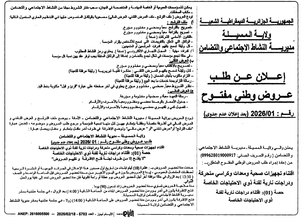 إعلان عن طلب عروض وطني مفتوح 2026/01 بعد عدم جدوى/ مديرية النشاط الاجتماعي لولاية المسيلة