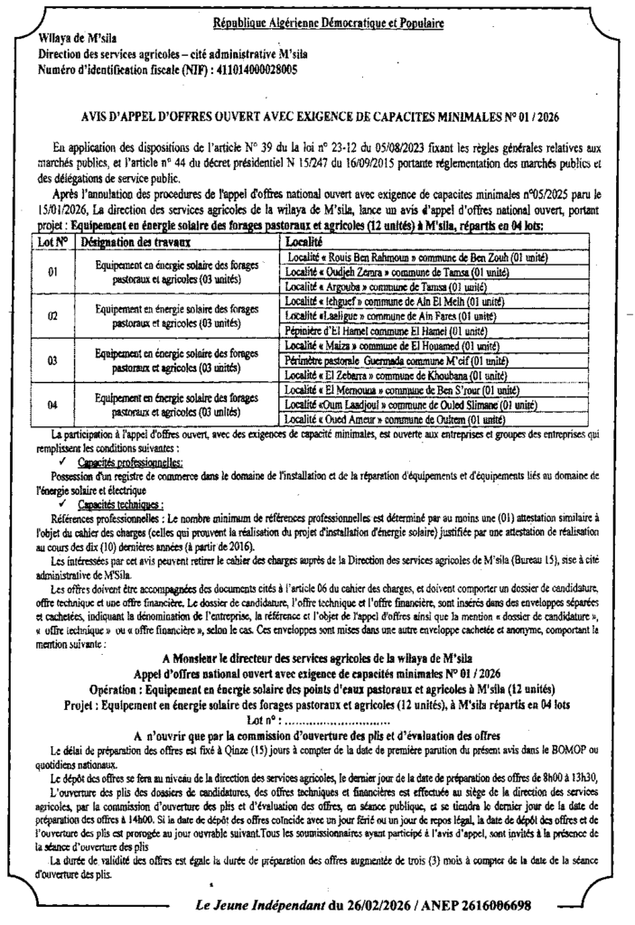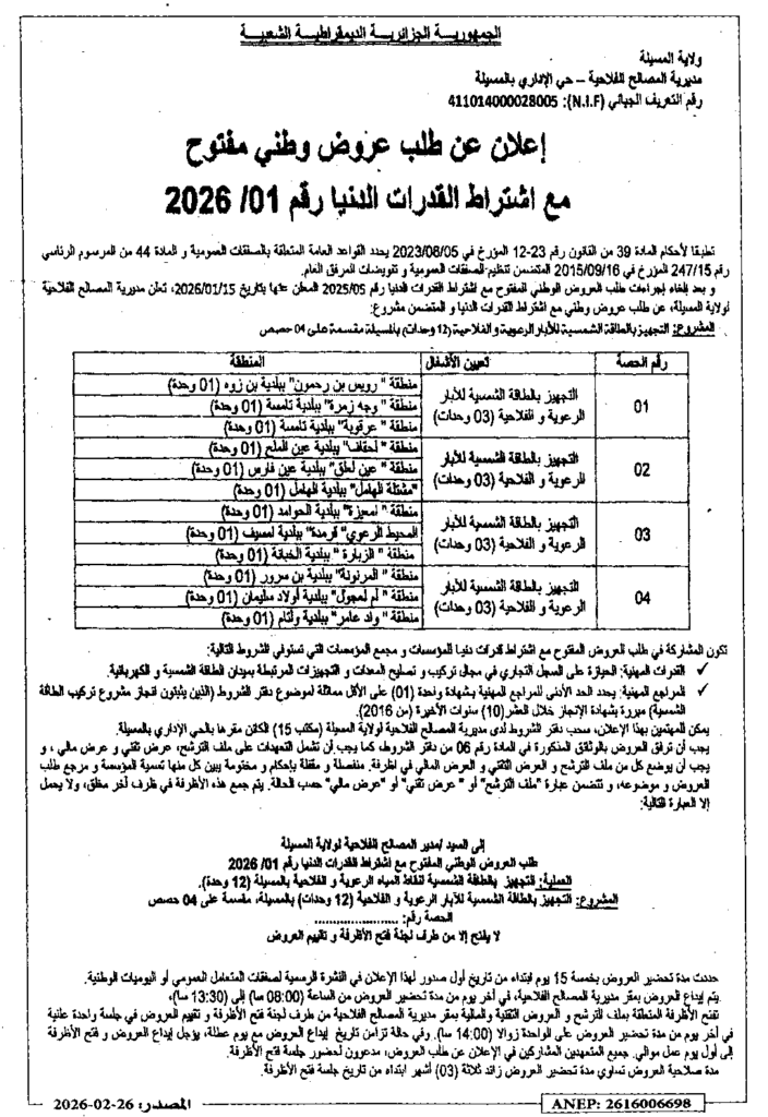 إعلان عن طلب عروض وطني مفتوح 2026/01 مديرية المصالح الفلاحية لولاية المسيلة