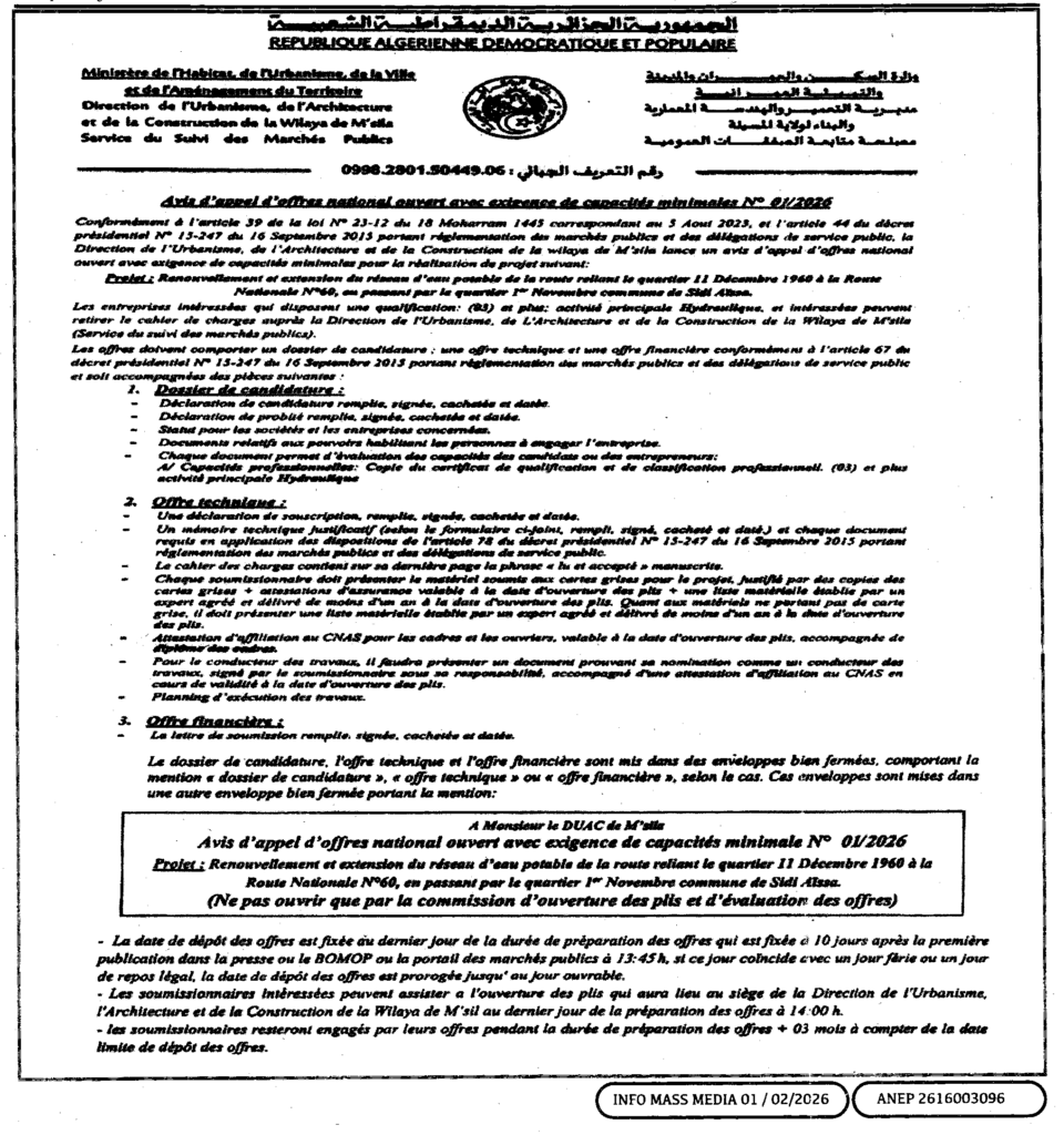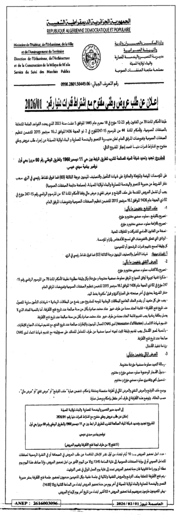 إعلان عن طلب عروض وطني مفتوح 2026/01 مديرية التعمير والهندسة المعمارية والبناء لولاية المسيلة