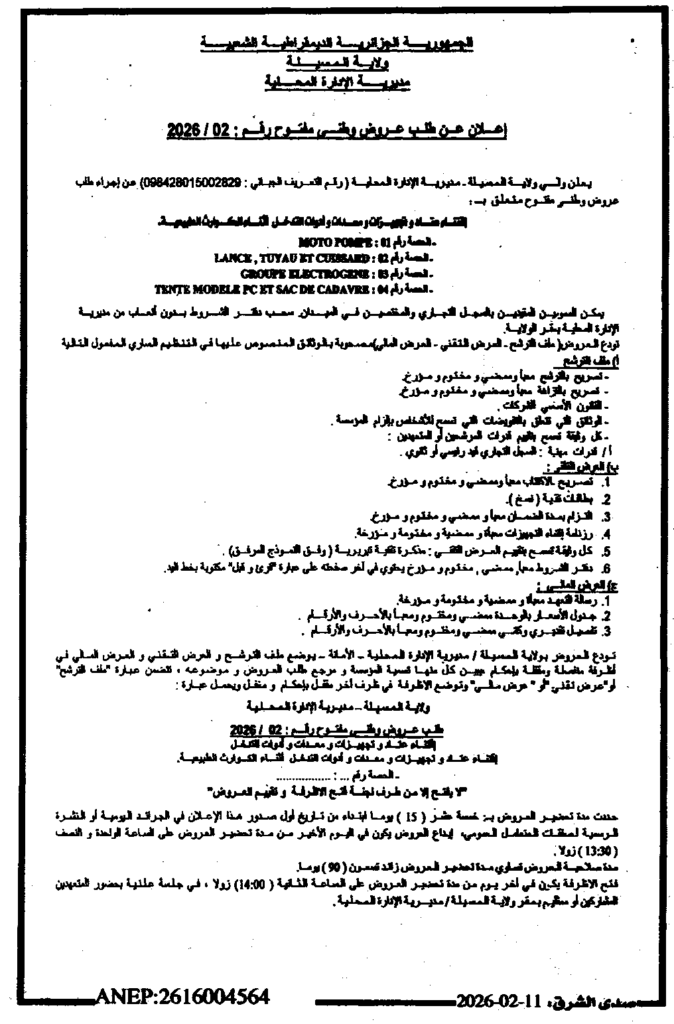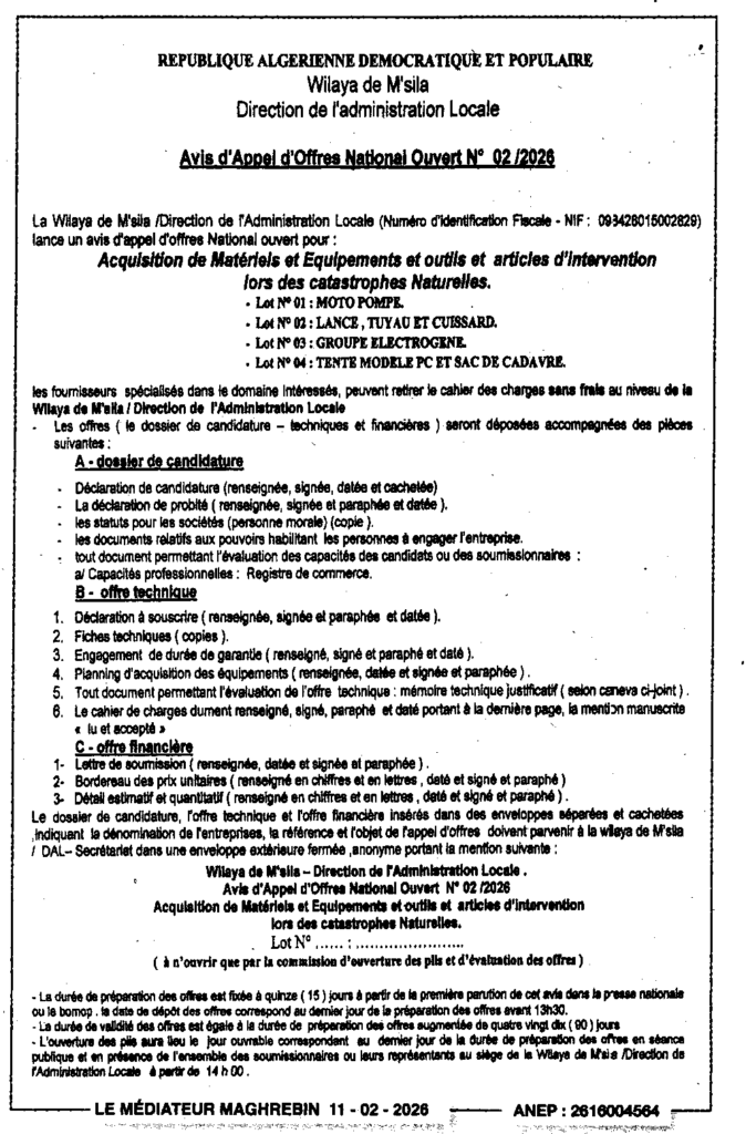 إعلان عن طلب عروض وطني مفتوح 2026/02 مديرية الإدارة المحلية لولاية المسيلة