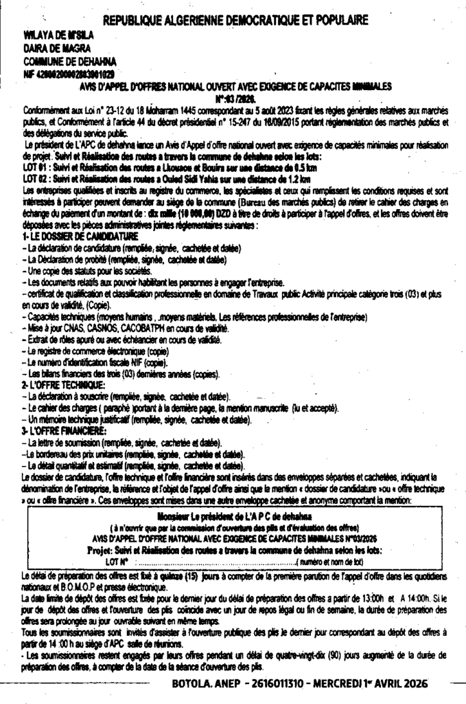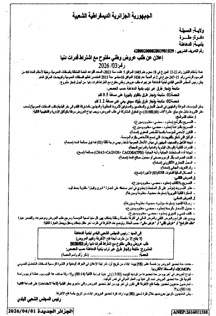 إعلان عن طلب عروض وطني مفتوح 2026/03 بلدية الدهاهنة