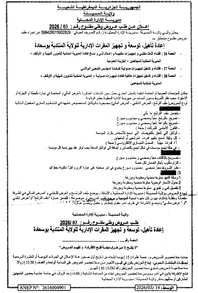 إعلان عن طلب عروض وطني مفتوح 2026/03 مديرية الادارة المحلية لولاية المسيلة