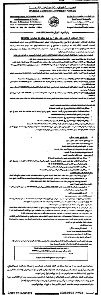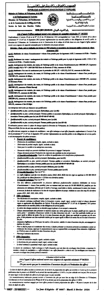 إعلان عن طلب عروض وطني مفتوح 2026/04 مديرية التعمير والهندسة المعمارية والبناء لولاية المسيلة