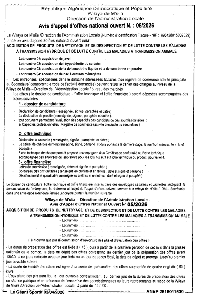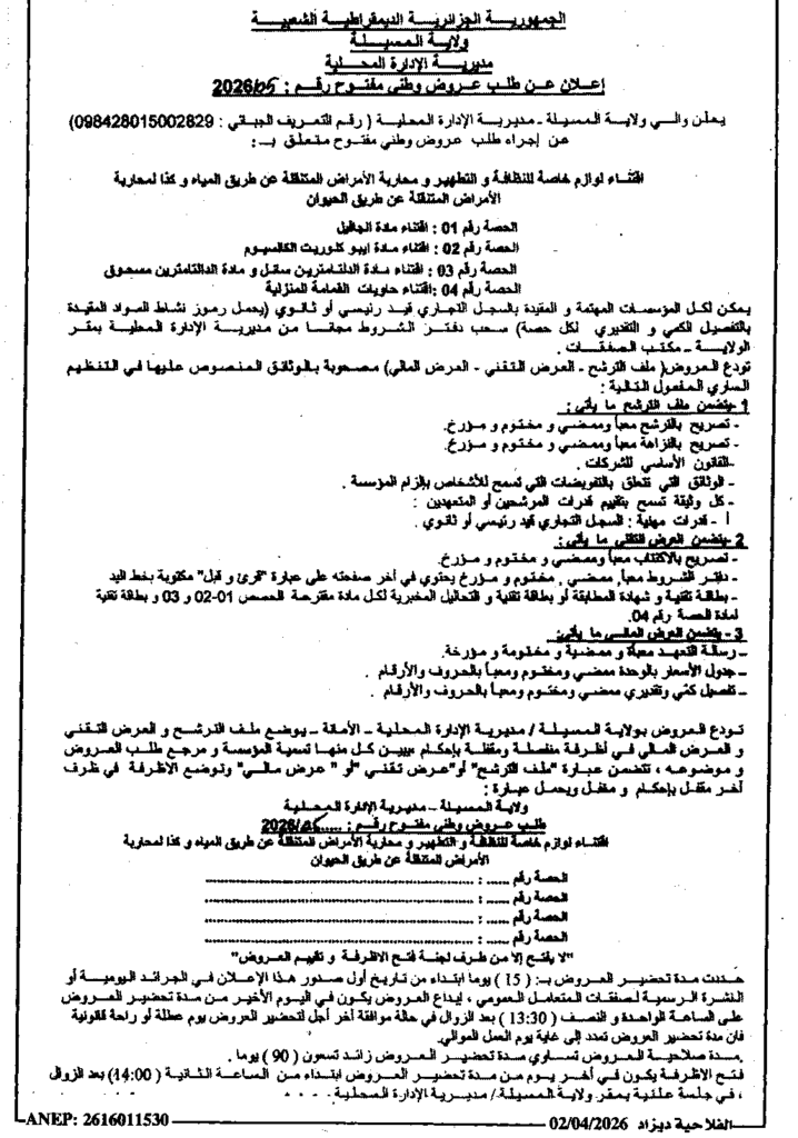 إعلان عن طلب عروض وطني مفتوح 2026/05 مديرية الإدارة المحلية لولاية المسيلة