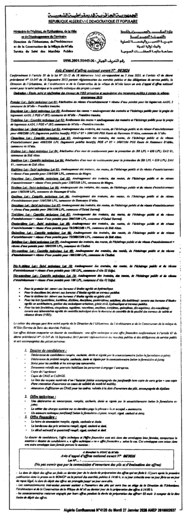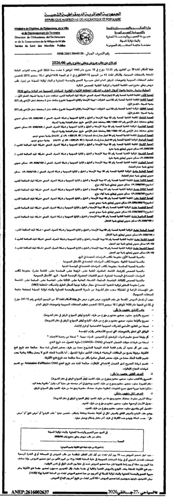 إعلان عن طلب عروض وطني مفتوح 2026/06 مديرية التعمير والهندسة المعمارية والبناء لولاية المسيلة