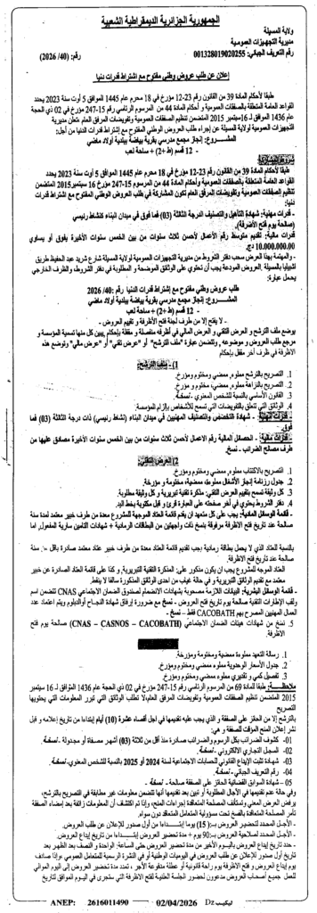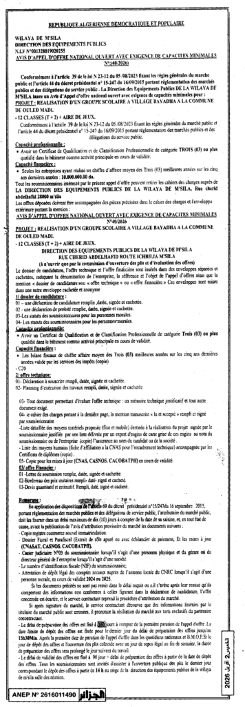 إعلان عن طلب عروض وطني مفتوح 2026/40 مديرية التجهيزات العمومية لولاية المسيلة