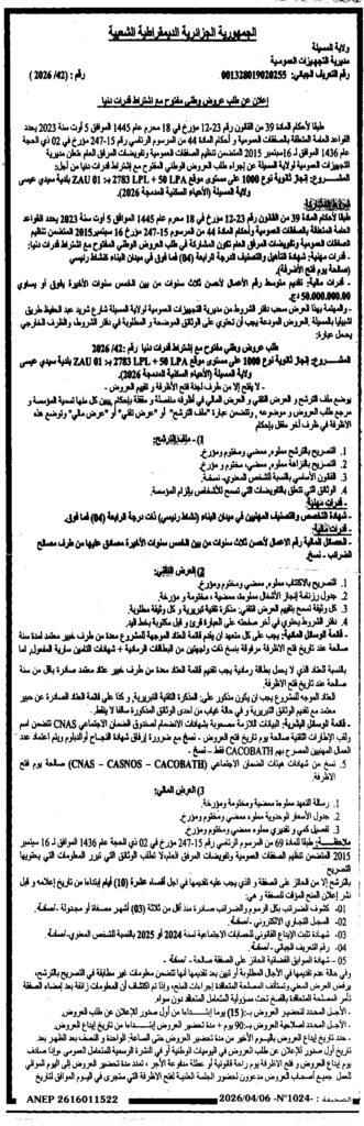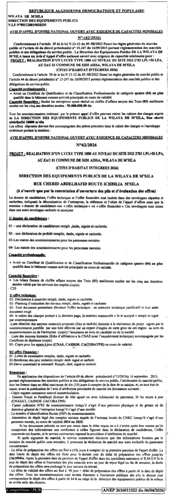 إعلان عن طلب عروض وطني مفتوح 2026/42 مديرية التجهيزات العمومية لولاية المسيلة