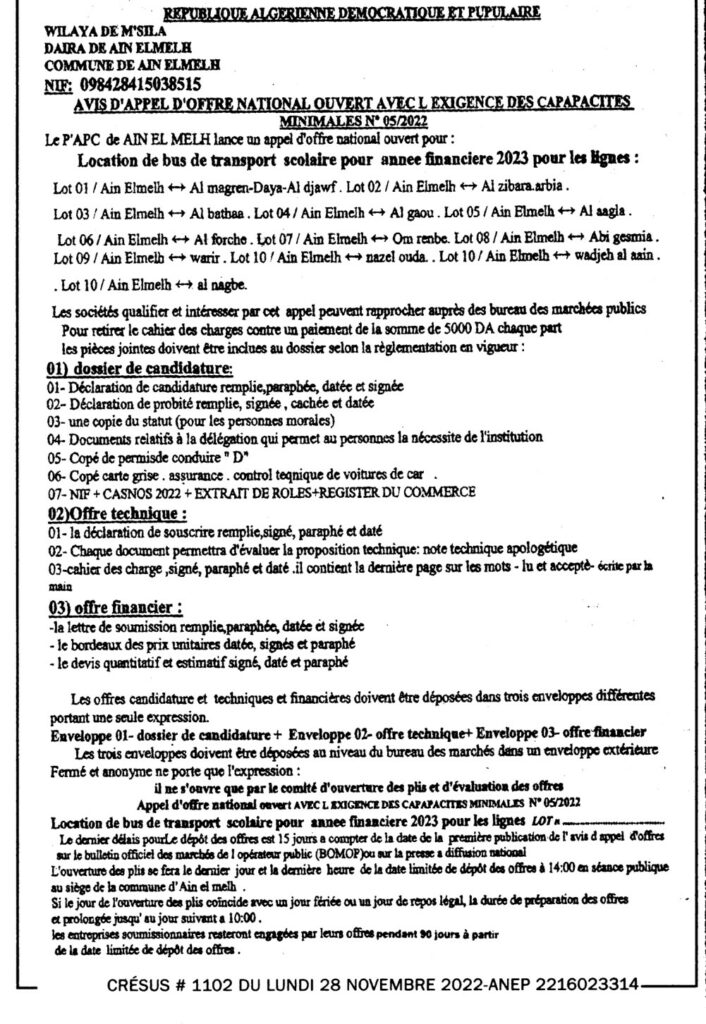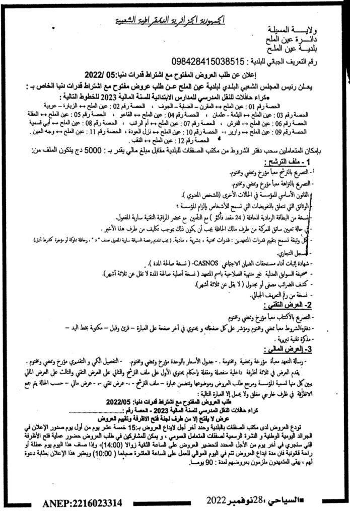 طلب العروض المفتوح مع اشتراط قدرات دنيا الخاص بـ : كراء حافلات للنقل المدرسي للمدارس الإبتدائية للسنة المالية 2023 للخطوط28 نوفمبر، 20220 15 شاركها فيسبوك X مشاركة عبر البريد طباعة