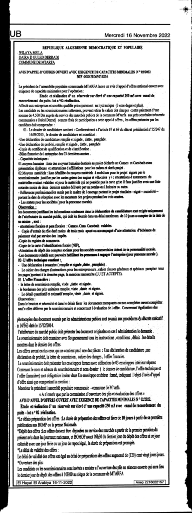 إعلان عن طلب عروض 2022/02 بلدية مطارفة