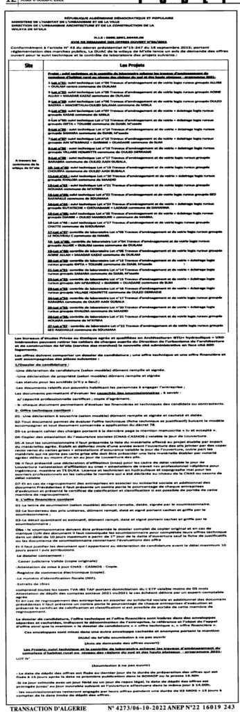 إعلان عن طلب عروض 2022/04 مديرية التعمير والهندسة المعمارية