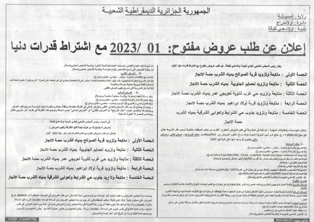 إعلان عن طلب عروض 2023/01 بلدية أولاد عدي لقبالة