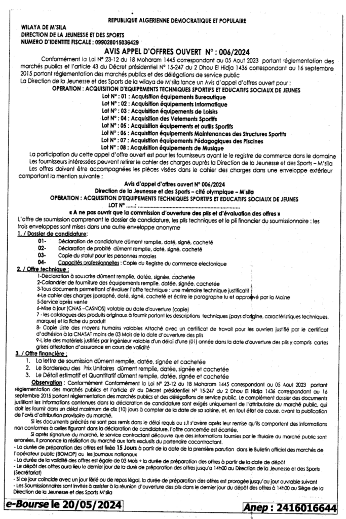 إعلان عن طلب عروض 2024/06 مديرية الشباب والرياضة لولاية المسيلة