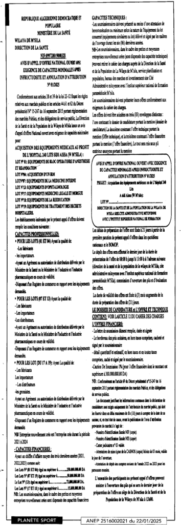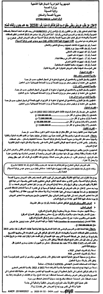 إعلان عن طلب عروض 2025/01 بعد عدم جدوى وإلغاء المنح/ مديرية الصحة والسكان لولاية المسيلة